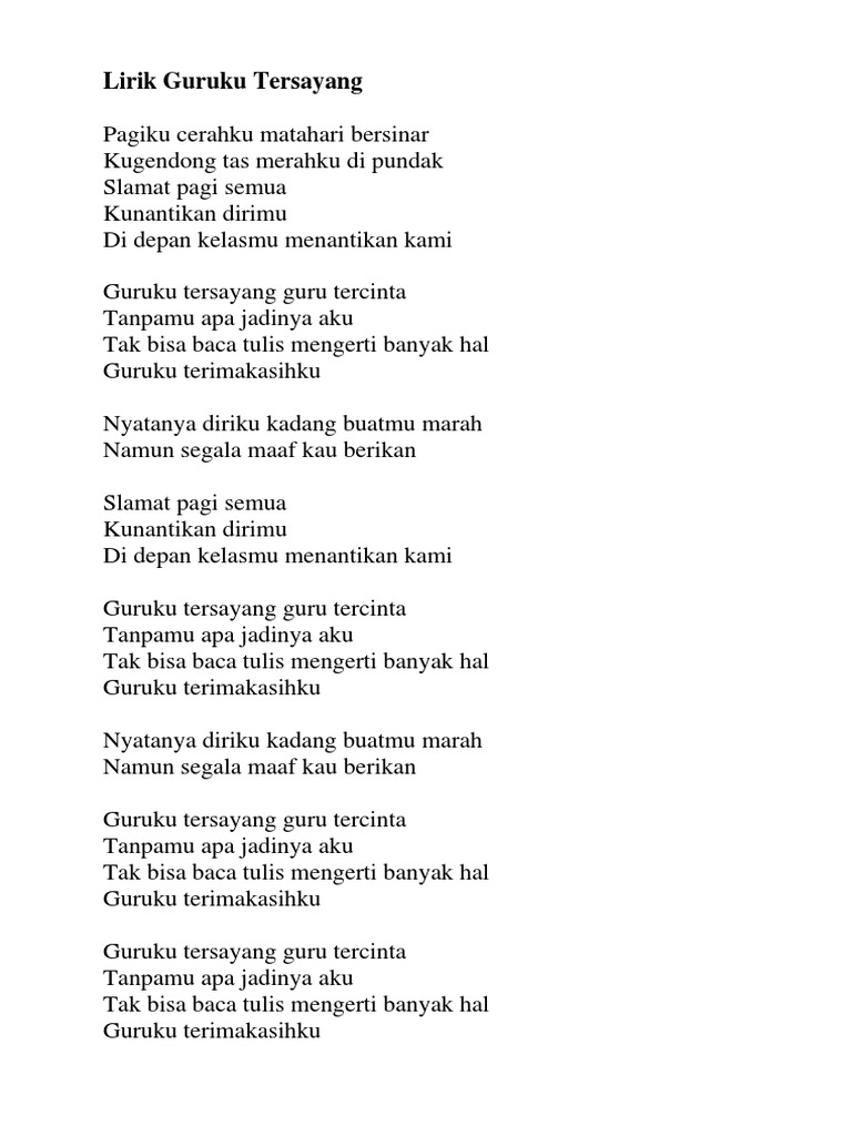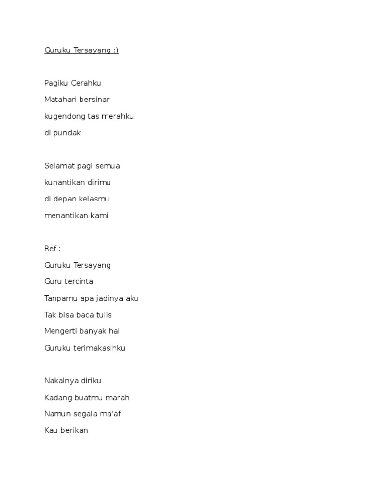 Pagiku Cerahku Matahari bersinar kugendong tas merahku di pundak Selamat pagi semua kunantikan dirimu di. 10 Pemain dengan Gaji Selangit di Premier League. Lirik Lagu Guruku Tersayang - Hallo sahabat LIRIK LAGU Pada Artikel yang anda baca kali ini dengan judul Lirik Lagu Guruku Tersayang kami telah mempersiapkan artikel ini dengan baik.